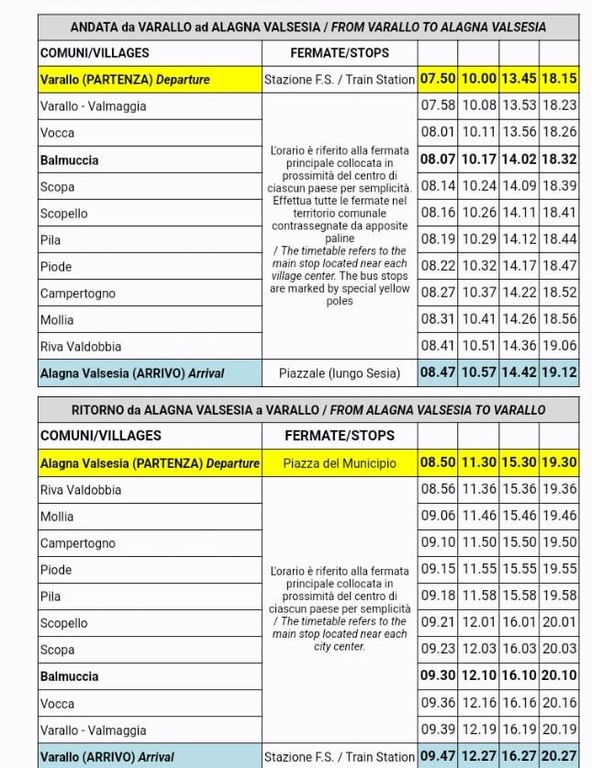 Il biglietto si farà a bordo, al prezzo stabilito dal tariffario regionale in base alle fasce chilometriche, la navetta rispetterà tutte le fermate dei bus ATAP e gli orari saranno articolati in modo da consentire una prima corsa al mattino presto (7,50 Varallo-Alagna, 8,50 Alagna-Varallo) ed un’ultima corsa la sera alle 19,30 da Alagna verso Varallo (18,15 Varallo-Alagna), oltre a due corse intermedie a metà mattina e metà pomeriggio in entrambe le direzioni.