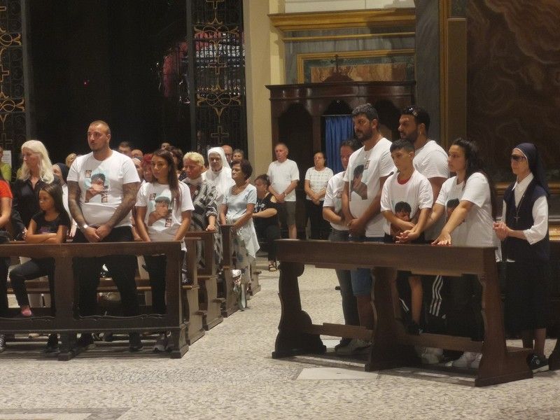 Tra i banchi, silenziosi e affranti, i parenti delle vittime: c'è chi indossa le magliette con stampati i volti dei propri cari, indossa il colore di un lutto inconsolabile e, silenziosamente, piange ascoltando le parole di Sant'Agostino: «Quello che eravamo prima l'uno per l'altro lo siamo ancora. Chiamami con il nome che mi hai sempre dato, che ti è familiare; parlami nello stesso modo affettuoso che hai sempre usato. Non cambiare tono di voce, non assumere un'aria solenne o triste. Continua a ridere di quello che ci faceva ridere, di quelle piccole cose che tanto ci piacevano quando eravamo insieme. Prega, sorridi, pensami... Asciuga le tue lacrime e non piangere, se mi ami: il tuo sorriso è la mia pace.».