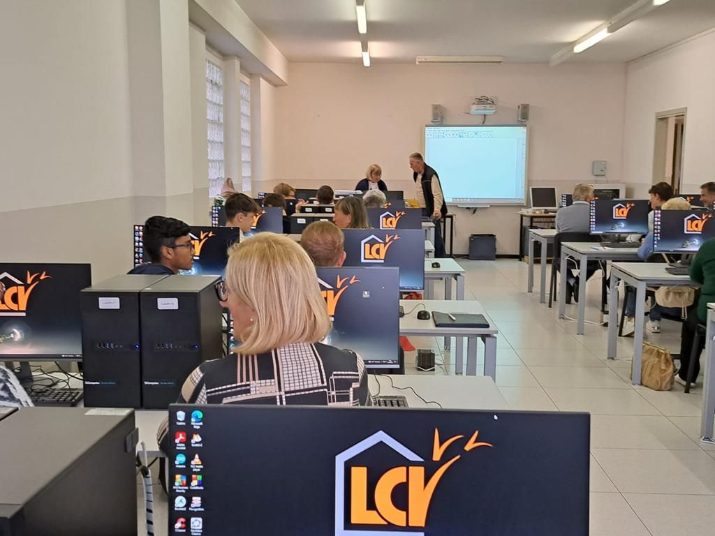 I corsisti hanno raggiunto l'aula informatica dove si tengono le lezioni con un autobus messo a disposizione dall’associazione di volontariato, grazie al finanziamento del progetto da parte dell'Unione Montana dei Comuni del Biellese Orientale. A coordinare il folto numero di studenti delle classi terze e quarte del Liceo, la professoressa Elda Brera Molinaro.