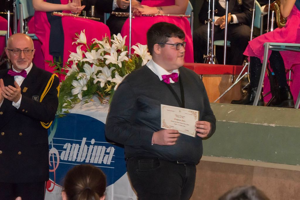 Il Premio Scuola Allievi “M° Michele Brignola”, dono dei nipoti Aurora ed Enrico Fossati, in memoria del nonno, consistente in un quadro con lo spartito musicale di “Excelsior Valsesiano”, è stato consegnato ad Alberto Maffioli, che si è distinto per l’impegno profuso nello studio e frequenza assidua alle prove ed ai servizi.