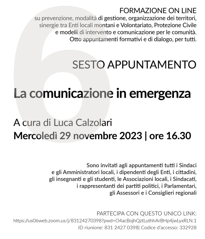 Oggi, mercoledì 29 novembre, alle ore 16:30, sarà possibile prendere parte al webinar “La comunicazione in emergenza”, a cura di Luca Calzolari, in materia di prevenzione.