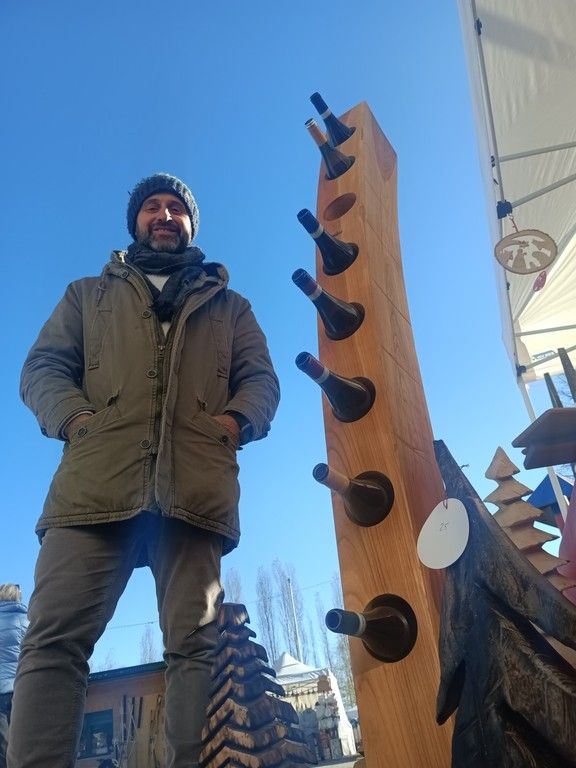 Tra le new entry degli espositori, ci avviciniamo al banchetto di Franco Vialardi, artista del legno, da Occhieppo Inferiore. Partito dalla vendita di legna da ardere, Franco è arrivato a creare composizioni ingegnose, spesso realizzate con materiale di scarto del magazzino: portabottiglie, portaoggetti, alberi stilizzati e un albero di Natale a chiocciola davvero unico nel suo genere.