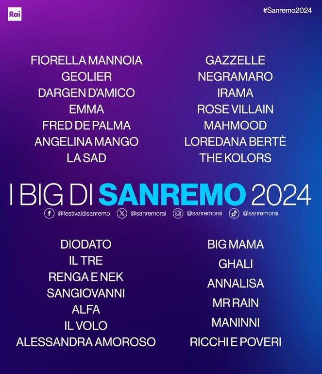 Al 74° Festival di Sanremo saranno in gara: Fiorella Mannoia, Geolier, Dargen D’Amico, Emma, Fred De Palma, Angelina Mango, La Sad, Diodato, Il Tre, Renga e Nek, Sangiovanni, Alfa, Il Volo, Alessandra Amoroso, Gazzelle, Negramaro, Irama, Rose Villain, Mahmood, Loredana Bertè, The Kolors, Big Mama, Ghali, Annalisa, Mr Rain, Maninni, I Ricchi e Poveri.