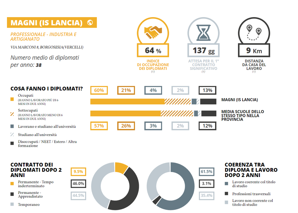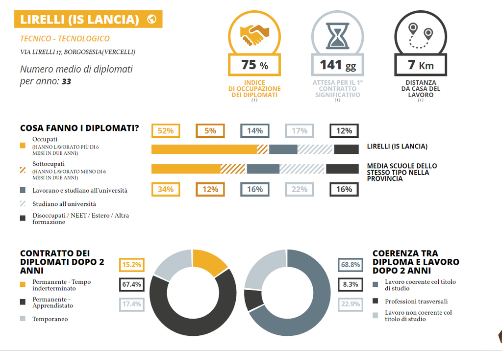 Istituto Lancia al vertice della classifica delle scuole superiori che garantiscono la più alta percentuale di inserimento nel mondo del lavoro dopo il diploma. E’ on line dal 22 novembre la ricerca Eduscopio 2023 della Fondazione Agnelli che analizza il tasso di occupazione degli studenti a due anni dalla maturità. E i dati premiano la scuola di Borgosesia con i due plessi, Istituto tecnico Lirelli e Istituto professionale Magni ai vertici nella provincia di Vercelli.
