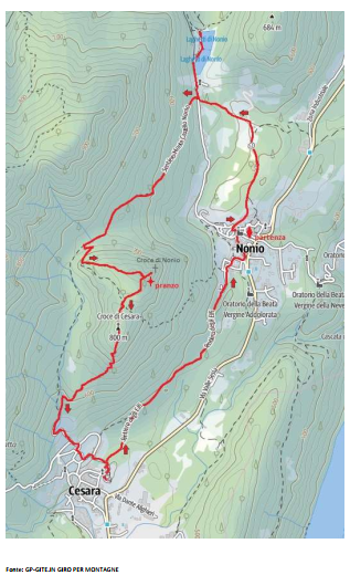 Dalla cima si torna alla sella dei faggi da dove si scende diagonalmente a sinistra raggiungendo in una decina di minuti Pra Castello. Da qui, per completare il piccolo anello si piega a sinistra pianeggiando lungamente nel bellissimo bosco fino a quando si imbocca una ripida e scivolosa mulattiera. Dopo altri 10 minuti si toccano le prime case del bel paesino di Cesara (il cui nome pare origini da un accampamento in loco di Giulio Cesare) su una pista di asfalto e cemento. Si cammina lungo via Pra Castello, via alla Costa, via Grandi e via Conti fin nei pressi dell’imponente parrocchiale di San Clemente dove si imbocca a sinistra una bellissima e pianeggiante mulattiera in direzione di Nonio. Si percorre questa bella traccia che tra ciclopi massi (arricchiti, si fa per dire…da statuette di gnomi e folletti) e dopo un passaggio davanti ad una cappelletta votiva conduce in una quindicina di minuti alle strette viuzze di Nonio.