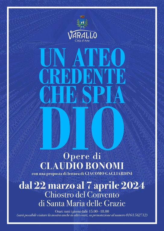 La Città di Varallo è lieta e onorata di presentare la mostra di Claudio Bonomi che sarà allestita nella meravigliosa cornice del Chiostro della Chiesa di Santa Maria delle Grazie da oggi 22 marzo a Domenica 7 Aprile. La personale di Claudio Bonomi, che qui si presenta, si articola su un dato argomento ma le opere proposte in esposizione non nascono da un unico momento creativo o narrativo, sono invece state scelte dall’autore come rappresentative di un proprio percorso, quasi una testimonianza personale, spalmato nel tempo e sintetizzato dal titolo “Un Ateo Credente che spia Dio”. Proprio per questa ragione si è scelto di non illustrare al visitatore i singoli soggetti in senso didascalico con un catalogo tradizionale, opera per opera, ma di accompagnarli semplicemente con un breve scritto introduttivo dell’artista stesso e da una proposta per una chiave di lettura di Giacomo Gagliardini, lasciando al visitatore ed alle sue conoscenze e sensibilità l’interpretazione personale ed il relativo messaggio che ciascuno potrà o vorrà trovare! La tecnica esecutiva di Claudio Bonomi è nota, sia nell’uso dei materiali che si presentano preziosi sia nelle lavorazioni meticolose e ricercate, per cui basterà richiamare l‘evidente legame estetico con l'arte bizantina e con le antiche lavorazioni dei metalli, come la cesellatura e la niellatura o la punzonatura, dove ogni punto non è messo a caso ma concorre, nell’insieme degli elementi, a creare una sinfonia ben orchestrata in un continuo crescendo e diminuendo dal carattere a mio avviso melodico. Nell’introduzione all’esposizione Claudio Bonomi scrive: “Alla domanda: “perché esiste l’Arte e a chi è necessaria, se è necessaria?” ciascuno, artista o persona partecipe, esprime una propria e personale risposta. Partendo dalla considerazione che ogni artista si attiene a proprie regole non vincolanti per altri, ritengo che la funzione di ogni Arte, se essa non è destinata ad essere merce di consumo, sia quella di stimolarci a riflettere sul motivo della nostra esistenza, sulla nostra presenza su questa terra, sul bene e sul male: solo – credo – dove esiste quell’eterna ed insaziabile nostalgia dell’ideale e della spiritualità l’Arte ha possibilità di affermarsi. Scopo dell’Arte è aspirazione al bello e perseguimento dell’ideale, ma ciò non vuol dire che si debbano rifuggire gli aspetti drammatici della vita. La vita è compenetrata dalla contraddizione che l’orribile sia racchiuso nello stupendo – e viceversa – che nell’Arte si presenta in una unità armonica e drammatica, dove tutto è contiguo e ogni cosa trapassa nell’altra. Ma il bello è precluso a coloro che non cercano la verità, colpiti da una profonda mancanza di spiritualità non percepiscono ma giudicano l’arte e si rifiutano di riflettere sul significato e sullo scopo della propria esistenza, nel senso più alto del termine.”