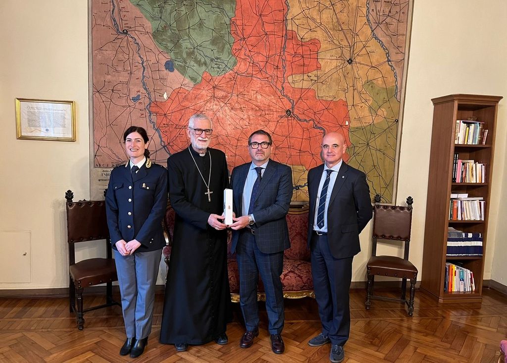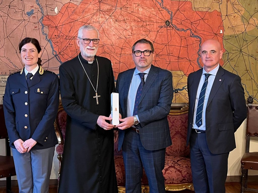 Nel corso di un incontro tenutosi in data odierna, il Questore di Vercelli Dott. Giuseppe MARIANI, unitamente al Vicario ed al Capo di Gabinetto della Questura, ha incontrato l’Arcivescovo Metropolita di Vercelli Mons. Marco ARNOLFO, per donare una confezione dell’olio del Giardino della Memoria, affinchè lo stesso possa essere consacrato in occasione del Mercoledì Santo.