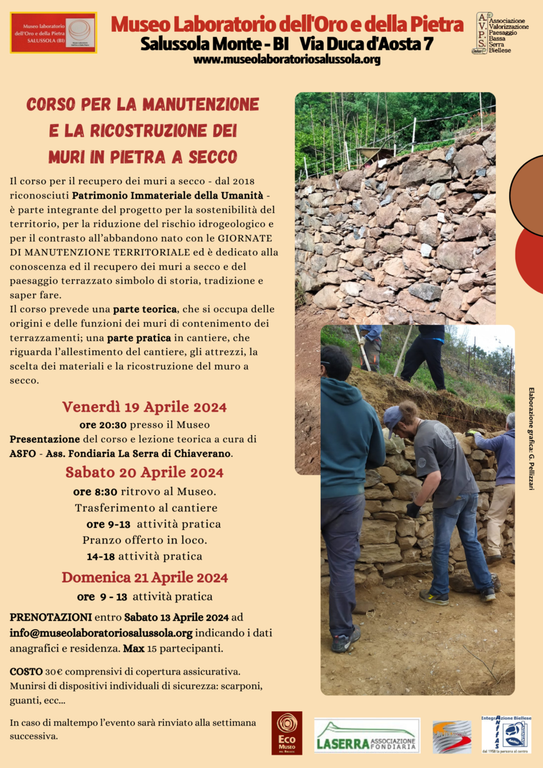 Il Museo Laboratorio dell’Oro e della Pietra di Salussola in rete con La Associazione Fondiaria La Serra di Chiaverano ha ripreso i corsi per valorizzare le architetture rurali dei paesaggi terrazzati dell’ anfiteatro della Serra morenica. Il laboratorio inizierà venerdi 19 Aprile 2024 alle ore 20,30 presso il Museo dell’Oro e della Pietra di Salussola via Duca d’Aosta 7, con una lezione teorica – di un’ora e mezza circa - che introduce le origini e le funzioni dei muri di contenimento dei terrazzamenti; sabato 20 Aprile alle ore 8,30, dal Museo ci si trasferirà al cantiere per dare inizio alla parte pratica-allestimento , attrezzi, scelta dei materiali e tutte le operazioni utili alla ricostruzione del muro in pietra a secco. Segurà una pausa pranzo che costituisce un momento conviviale, nel pomeriggio si riprenderà l’attività per circa quattro ore; nella mattinata di domenica 21 si completeranno i lavori. Costo complessivo di 30 euro, comprensivo di copertura assicurativa. Pranzo offerto dall’Anffas Cascina Carrubi sede del cantiere. Iscrizioni entro il 17 aprile, max 15 partecipanti info@museolaboratoriosalussola.org. Corso sostenuto dalla Fondazione C.R.B.