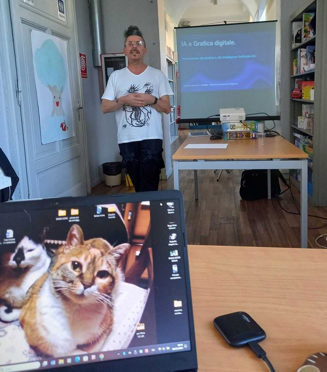 Mercoledì 8 maggio, ultimo incontro in biblioteca a Grignasco del corso Biblioteche e nuove frontiere, con l’artista e creativo Enrico Pettinaroli, che ha introdotto un tema estremamente attuale: l’Intelligenza Artificiale e la grafica digitale.