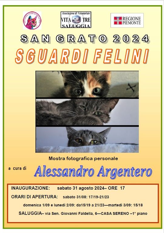 Sabato 31 agosto 2024, alle ore 17,00 nei locali di Casa Sereno, presso l’Associazione Vita Tre di Saluggia (Vc), in occasione della Festa Patronale di San Grato, sarà inaugurata la mostra fotografica di Alessandro Argentero “Sguardi felini”.