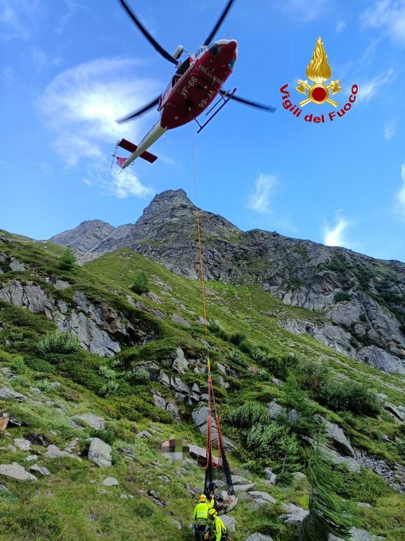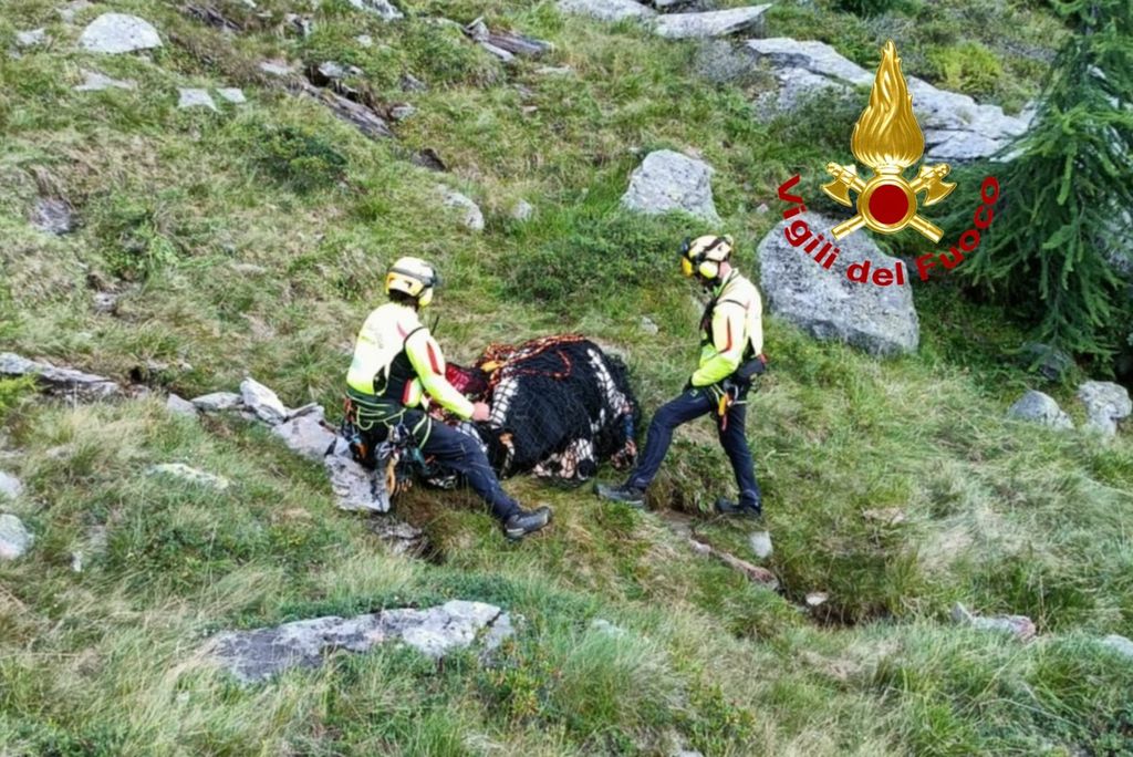 Ieri martedì 3 settembre intorno alle ore 17:30 i Vigili del Fuoco del distaccamento volontario di Alagna, insieme al nucleo elicotteri di Torino, sono intervenuti per il soccorso e recupero di un bovino rimasto ferito ad una zampa durante il pascolo in località Alpe Jazza Superiore nel comune di Alagna ad una quota di 2150 metri.