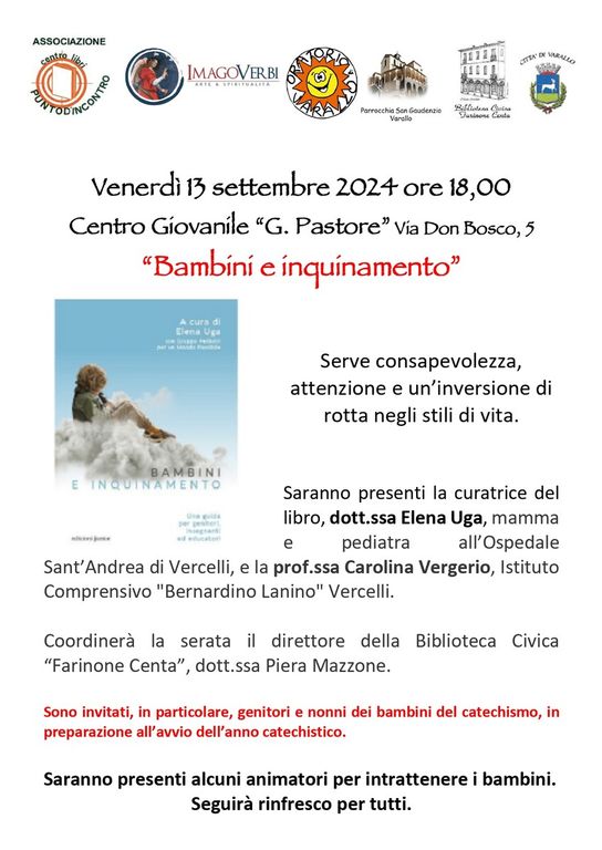 Venerdì 13 settembre, alle ore 18, presso il Centro Giovanile “G. Pastore” (Via Don Bosco n. 5), il Centro Libri-Punto d’Incontro, la Biblioteca Civica “Farinone-Centa”, l’Associazione Imago Verbi, la Parrocchia di Varallo, hanno organizzato un incontro con Elena Uga, pediatra all’ospedale Sant'Andrea di Vercelli, che ha curato il libro: “Bambini e inquinamento”, alla cui stesura ha partecipato il gruppo Pediatri per un Mondo Possibile, che si occupa delle correlazioni tra inquinamento ambientale e salute del bambino. Carolina Vergerio, insegnante alla Scuola Media “S. Pertini” Istituto Comprensivo "Bernardino Lanino" Vercelli, dialogherà con l’Autrice.