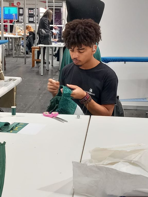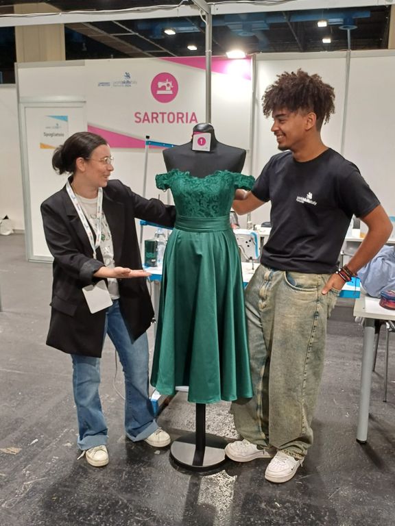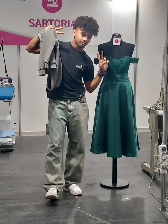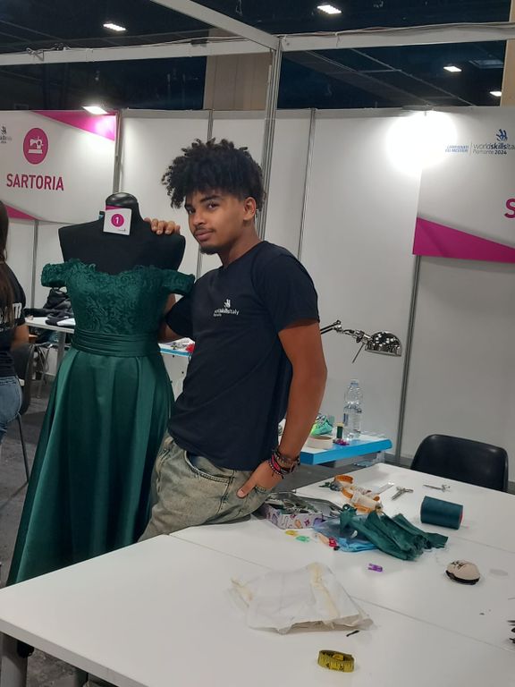 Alexis Mateo Aquino, 18 anni, di Serravalle, studente della classe quarta moda dell’Istituto professionale Magni di Borgosesia. C’era anche lui tra gli oltre 150 concorrenti di World skills Piemonte 2024, il concorso che va alla ricerca dei “campioni” dei mestieri artigianali. Aquino, accompagnato dalla sua tutor, Anna Novali, docente di laboratorio, ha gareggiato insieme ad altri 5 per la categoria “Sarti su misura”. Un impegno, a Torino, di tre giorni complessivi tra la consegna della collezione da realizzare, il 22 ottobre, con relativa estrazione della postazione di lavoro e prova delle macchine, la confezione del manufatto in tutta la giornata del 23 e il 24 mattina, e la premiazione il 24 pomeriggio. Oggetto della competizione era la realizzazione di una mini collezione con campioni di tessuto assegnati dalla commissione, moodboard e disegno in piano su supporto digitale. Nello specifico i concorrenti dovevano realizzare un abito con bustino steccato in pizzo e foderato, gonna a mezza ruota e cintura drappeggiata. “È stata un’esperienza formativa e sfidante – commenta la prof.ssa Novali – in cui è stato possibile anche confrontarsi con altre scuole del nostro stesso indirizzo. Sicuramente impegnativa e intensa ma il nostro studente l’ha affrontata distinguendosi per precisione e serietà portando a termine il suo lavoro in modo eccellente. Va detto che era tra i più giovani e alla prima esperienza con concorsi di questo livello in cui per due giorni si lavora a ritmo serrato e il candidato deve gestire tutte le fasi dell’attività esclusivamente basandosi sulle proprie capacità perché noi tutor non eravamo autorizzati ad aiutarli in nessun modo”. I concorrenti, tutti tra i 18 e i 25 anni, venivano da enti e scuole di formazione professionali del Piemonte e gareggiavano per le categorie Acconciatura, Costruzioni in mattoni, Cucina, Estetica, Falegnameria, Fresatura CNC, Grafica, Hotel reception, Pasticceria, Progettazione CNC, Riparazione autovetture, Sartoria, Servizi sala bar, Sistemi robotici e tecnologie di laboratorio chimico.