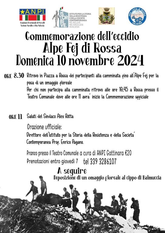 Domenica 10 novembre sarà celebrato l'ottantesimo della strage di partigiani all'alpe Fej avvenuto il 7 novembre 1944. Ritrovo alle 8.30 in piazza a Rossa dei partecipanti alla camminata verso l'alpe Fej per la posa di un omaggio floreale. Per chi non partecipa alla camminata ritrovo alle 10.45 a Rossa presso il teatro comunale dove alle 11 avrà inizio la commemorazione ufficiale. Previsti i saluti del sindaco Alex Rotta. Orazione ufficiale di Enrico Pagano, direttore dell'istituto per la storia della Resistenza e della società contemporanea. Pranzo al teatro comunale a cura di Anpi Gattinara. Prenotazioni al numero 339.328.6107. A seguire deposizione di un omaggio floreale al cippo di Balmuccia.