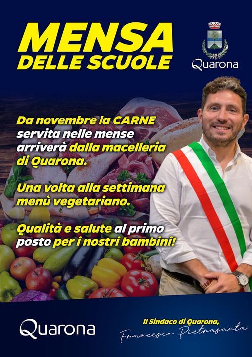 A Quarona novità per la mensa scolastica. "Siamo sempre stati contenti del nostro servizio mensa con una marcia in più - spiega il sindaco Francesco Pietrasanta -. Abbiamo un punto cottura interno, stesso personale da oltre 20 anni, una cuoca dedicata per l'asilo nido". Ma annuncia anche le novità: "La carne servita sarà della macelleria Jonfer, il pasto vegetariano una volta a settimana ed educazione alimentare. Qualità al primo posto per i nostri bambini"