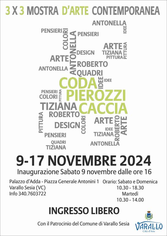Si inaugurerà sabato 9 novembre 2024, alle ore 16, a Palazzo D’Adda, la Mostra d’Arte contemporanea 3 x 3, allestita con il patrocinio del Comune di Varallo Sesia. Il titolo 3 x 3 perché saranno tre le mostre personali che si potranno ammirare all’interno delle prestigiose sale del Palazzo. Roberto Caccia sarà presente con “Luci e Colori nel Paesaggio”, nostalgiche atmosfere dense di poesia. Antonella Coda con “Il Segno e il Colore” proporrà una serie di lavori ove la pennellata decisa ed il colore domineranno la tela. Tiziana Pierozzi con “Radici” ci porterà a rivedere realisticamente luoghi e paesaggi del territorio.