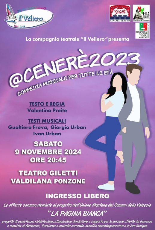 Sabato 9 novembre, al teatro Giletti di Ponzone, la compagnia teatrale “Il Veliero" metterà in scena la commedia musicale “@Cenerè2023” per sostenere, con gli incassi, il progetto dell’Unione Montana Valsesia “La Pagina Bianca”, che offre assistenza, riabilitazione, stimolazione domiciliare e supporto alle persone affette da Alzheimer e altre malattie neurodegenerative e alle loro famiglie. «Ringrazio “Il Veliero” per questa bella e generosa iniziativa a favore del nostro progetto – dice l’Assessore ai Servizi Socioassistenziali dell’UMV, Francesco Nunziata – “La pagina bianca”, avviato nel 2021 grazie alla generosa donazione Burocco, ora è alla fine del primo triennio di attività. I fondi ricevuti ci hanno consentito di creare un team di professionisti ad hoc, che ha fornito e continua a fornire assistenza ai pazienti. I fondi a poco a poco però si fanno più esigui – spiega Nunziata – quindi iniziative come quella del “Veliero” sono fondamentali: riusciamo infatti a mantenere il servizio grazie alle donazioni e presto apriremo anche un cassetto presso Fondazione Valsesia – continua l’amministratore – perché siamo consapevoli della grande importanza per il territorio di questo progetto. Il nostro obiettivo, che confido di poter raggiungere in tempi ragionevoli, è far diventare rientrare definitivamente questo servizio nella struttura del Socioassistenziale».