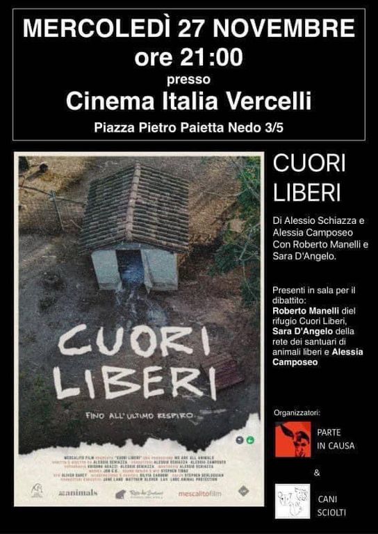 Il film documentario “Cuori Liberi. Fino all’ultimo respiro” arriva a Vercelli, presso il Cinema Nuovo Italia, mercoledì 27 novembre 2024, alle ore 21. Presenti in sala per la presentazione: Roberto Manelli, volontario e portavoce del rifugio Cuori Liberi, Sara D’Angelo, portavoce della Rete dei Santuari di animali liberi, Alessia Camposeo, co-produttrice del film. Organizzano la presentazione i collettivi antispecisti Parte in Causa e Cani Sciolti.