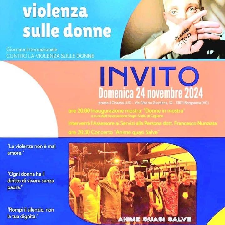 Ore 20:00 - Inaugurazione della mostra "Donne in mostra", a cura dell'Associazione Sogni Scalzi di Cigliano. Un’esposizione che esplora le storie di coraggio, resilienza e speranza di donne che hanno affrontato situazioni di violenza.