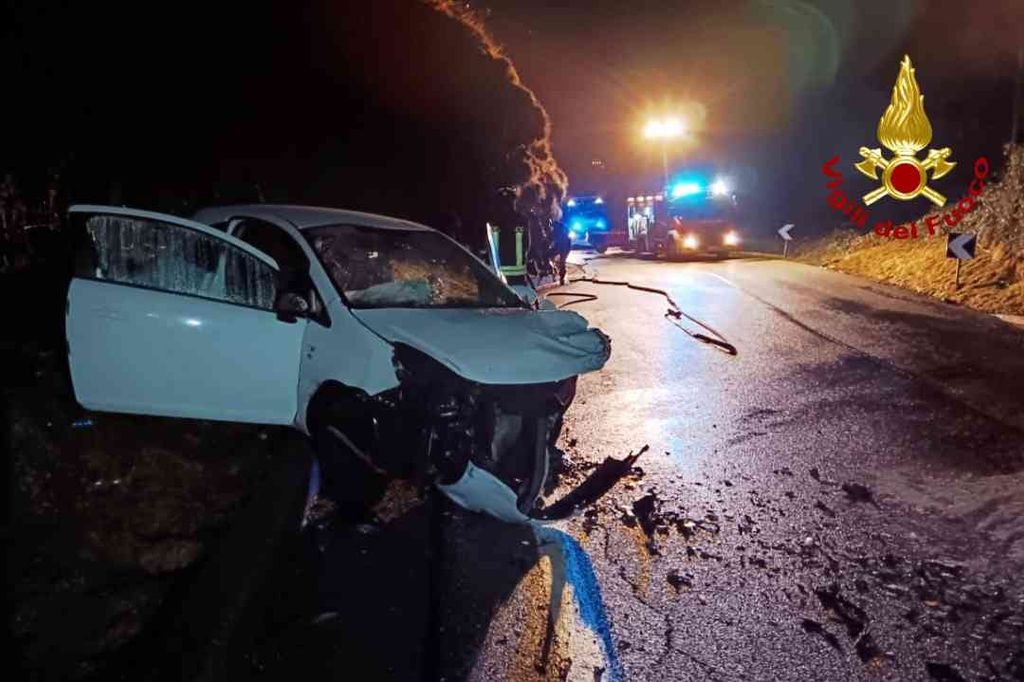 Incidente stradale causa incendio di una vettura, intervengono i vigili del fuoco.