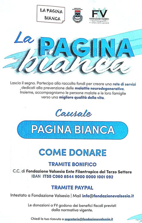 <abbiamo>Laura Cerra, Presidente di Fondazione Valsesia, accoglie con entusiasmo la nuova missione: “Far nascere un fondo che ha l’obiettivo di sostenere un progetto di grande valore come “La Pagina Bianca” significa, per Fondazione Valsesia, prendersi cura della nostra Comunità, centrando così appieno lo scopo per il quale siamo nati”. NB: I cittadini, le organizzazioni o le imprese che effettueranno donazioni a favore del fondo potranno usufruire di tutti i benefici fiscali previsti dalla legge italiana: intera deducibilità per le imprese, destinazione 5 per mille, detrazioni fiscali pari al 30% o 35% (a seconda della tipologia dell’ente beneficiario) per le donazioni in denaro o beni. </abbiamo>