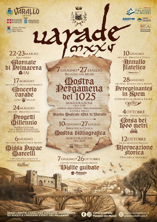 L’Amministrazione comunale, come preannunciato nell’incontro pubblico del 20 novembre 2024, con la fondamentale collaborazione del Gruppo organizzativo e di tante Persone ed Enti che stanno offrendo il loro prezioso contributo, propone una prima serie di eventi – seguirà la pubblicizzazione di altri attualmente in corso di definizione – per celebrare il Millennio di Varallo (1025-2025).