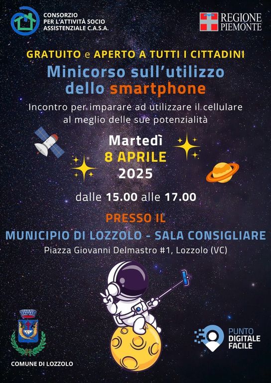 IL Consorzio Socio Assistenziale CASA ha organizzato un corso per l’uso dello smatphone dedicato a tuti ma in particolar modo alla fascia anziana della popolazione che ha più difficoltà nel uso materiale dei dispositivi elettronici. “Infatti a differenza dei giovani che necessitano di corsi per uno “consapevole” del cellulare, gli anziani hanno necessità di imparare e migliorare l’uso quotidiano che diventa sempre più necessario anche alla luce delle nuove funzionalità predisposte dalle amministrazioni pubbliche” commenta il Sindaco Sella Roberto.
