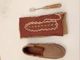 Nel laboratorio di Quarona, in località Campi Dell’Oro, sono impegnati giovani con diverse disabilità che hanno l’opportunità di formarsi con un lavoro vero. Marta è la “regina del laboratorio”, cuore pulsante del Progetto Scapìn e ne illustra i contenuti: “In un momento di forte crisi e calo delle commesse è nata l’idea di realizzare un prodotto d’artigianato che rispecchiasse i nostri valori. L’Associazione Villa Rolandi, che sostiene da sempre il nostro laboratorio, ha partecipato al Bando “Fatto Bene” della Fondazione Valsesia per trovare le risorse per avviare il progetto. Grazie a quel contributo abbiamo cominciato la formazione, che è necessariamente lunga, perché realizzare scapìn è un’attività complessa, che richiede un sapere artigianale antico, materiali e attrezzi ormai inusuali e tecniche uniche. In più per noi ha due valori importanti: è sociale ed ecosostenibile!”