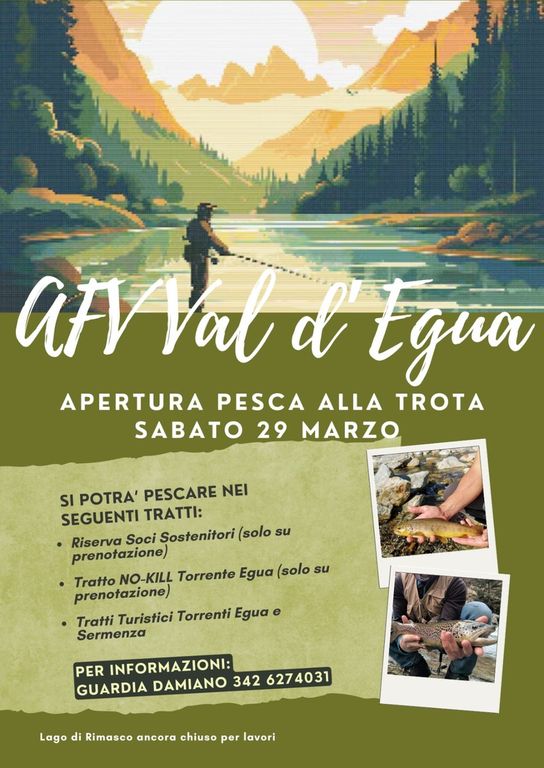 Sabato 29 marzo apre la stagione 2025 di pesca alla trota nei territori del comune di Alto Sermenza. I tratti in cui è permesso pescare sono i seguenti: presso la Riserva Soci Sostenitori (solo su prenotazione), nel tratto no-kill Egua (solo su prenotazione) e nei tratti turistici Egua e Sermenza.