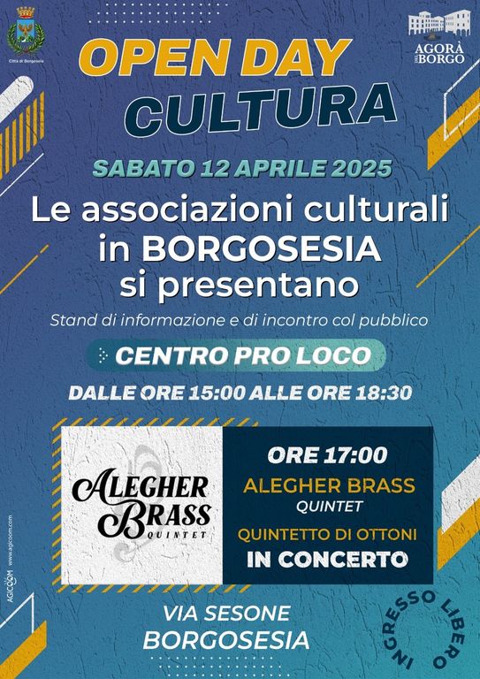 L’open day è stato studiato e voluto, dal Comune e dalla Consulta Agorà del Borgo, per “mettere in mostra” le associazioni, nel senso letterale del termine: l’intento è quello di mostrare alla città il lavoro dei volontari, che sono impegnati nella tutela e promozione del patrimonio culturale di Borgosesia: Nel ridotto del teatro Pro Loco i cittadini potranno incontrare i volontari e consultare il materiale divulgativo relativo alle loro attività – dice Bruno Rinaldi – ma sarà anche un momento di incontro e confronto tra le associazioni stesse, da cui non potranno che nascere nuovi stimoli e collaborazioni tra i vari gruppi. Nel corso del pomeriggio, come primo esempio di collaborazione tra associazioni- aggiunge – si potrà assistere ad un prezioso concerto del gruppo “Alegher Brass Quintett”, gruppo di giovani musicisti di talento, che collaborano strettamente con la nostra prestigiosa Orchestra Fiati Città di Borgosesia.