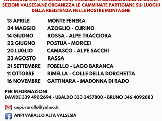 Quest'anno si festeggia l'80° della liberazione dal nazifascismo in Italia e tornano le Camminate Partigiane organizzate dall’ ANPI Varallo Alta Valsesia, in collaborazione con l’Istituto per la storia della Resistenza e della società contemporanea nel Biellese, nel Vercellese e in Valsesia, e altre sezioni Valsesiane, per celebrare i luoghi della Resistenza sulle nostre montagne.