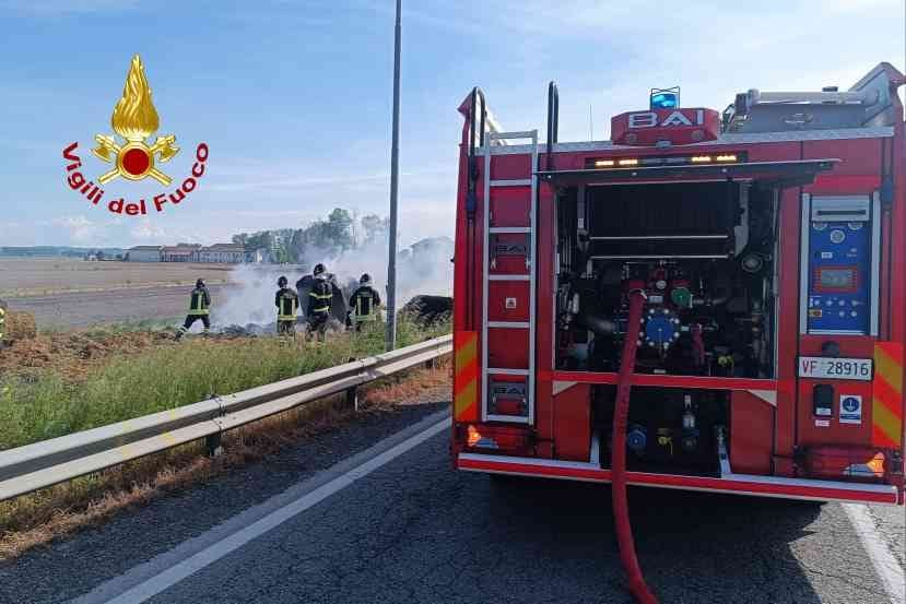 Nel pomeriggio del 26 aprile, intorno alle 16, la squadra dei Vigili del Fuoco della Centrale di Vercelli insieme a quella dei mezzi speciali con l'autobotte sono intervenute sulla Sp455 nel comune di Desana per un incendio di rotoballe di fieno trasportate su un rimorchio.