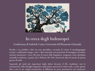 In occasione della presentazione il prof. Gabriele Costa, professore associato presso il Dipartimento di Studi Umanistici dell'Università del Piemonte Orientale, terrà la conferenza: "In cerca degli Indoeuropei". L’oratore, utilizzando gli strumenti della Linguistica comparata, attraverso le fonti orali e scritte giunte fino a noi, ricostruirà la storia della famiglia linguistica indoeuropea, le sue origini preistoriche, la diffusione in epoca protostorica nel continente euroasiatico, l’epoca storica e medievale con la nascita delle lingue romanze e germaniche, e poi la situazione linguistica italiana dal primo millennio a.C. fino ad oggi.