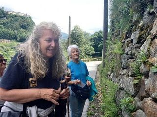 Semplicemente camminando lungo la strada asfaltata che conduce alle due frazioni di Varallo, osservando lo splendido muretto a secco, ecosistema protetto dall’Unesco, si è aperto un mondo. Angela Vicario, validamente coadiuvata dal botanico Gianfranco Rotti, ha presentato piante, erbe, arbusti: dall’“erba cornacchia", l’erba dei cantanti, alla Celidonia Maior, che secerne un lattice che riduce le mitosi cellulari, alle piante infestanti come la Buddleja davidii, classificata come pianta invasiva e pericolosa, ben più della Robinia, alla Fallopia japonica, illustrando la differenza tra Geranium, che cresce spontaneo nel bosco e Pelargonium che adorna i nostri balconi. Erba betonica, Achillea, Sambuco, Valeriana, Rumex acetosa, Euforbia, Uva turca, già nominata dal Manzoni come presente nell’orto di Renzo, ma anche l’Hosta dalle grandi foglie ornamentali, che predilige i luoghi ombrosi, gli alberi, come l’Ontano, che brucia anche quando è ancora verde oppure bagnato, perché contiene una resina, dal legno tanto resistente da essere stato utilizzato per realizzare i pali che sostengono Venezia, e l’Iperico, utilizzato per fare un prezioso olio che lenisce le scottature: ogni pianta è stata individuata e descritta con grande passione e competenza.