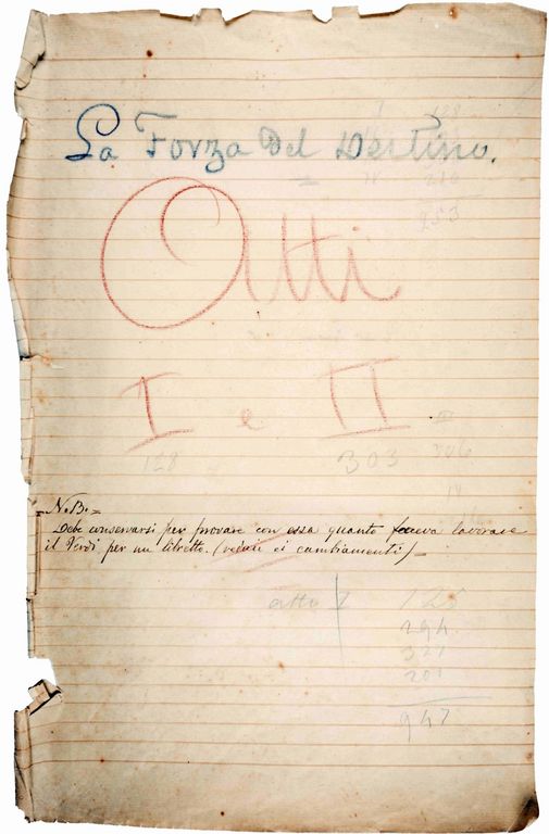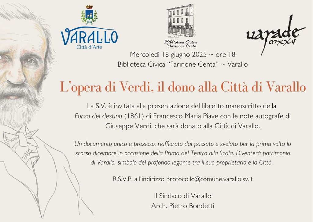 Mercoledì 18 giugno, alle ore 18, presso la Biblioteca Civica “Farinone - Centa” di Varallo, la cittadinanza è invitata alla presentazione alla stampa e alle autorità del libretto manoscritto dell'Opera “La forza del destino” (1861), di Francesco Maria Piave, corredato da numerose note autografe di Giuseppe Verdi, documento unico e prezioso che verrà donato alla Città di Varallo e conservato in Biblioteca Civica. Il proprietario del prezioso manoscritto, ha espresso la volontà di farne dono alla Città di Varallo, come simbolo del suo profondo legame con la località valsesiana della quale è Cittadino Onorario.