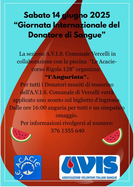 Avis Comunale Vercelli per l'occasione organizza un evento speciale alla piscina “Le Acacie” di Corso Rigola 128. A partire dalle 16:00, tutti i partecipanti potranno gustare anguria fresca e ricevere un simpatico omaggio e i donatori muniti di tesserino AVIS Vercelli avranno diritto a uno sconto sul biglietto d’ingresso.