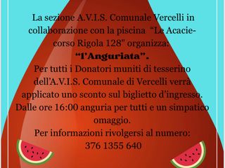 Avis Comunale Vercelli per l'occasione organizza un evento speciale alla piscina “Le Acacie” di Corso Rigola 128. A partire dalle 16:00, tutti i partecipanti potranno gustare anguria fresca e ricevere un simpatico omaggio e i donatori muniti di tesserino AVIS Vercelli avranno diritto a uno sconto sul biglietto d’ingresso.