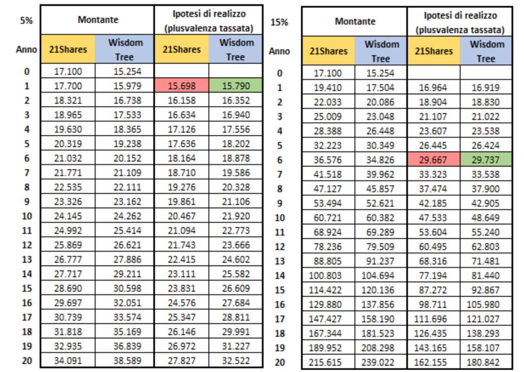 Ho ipotizzato un investimento iniziale di 10.000€, che oggi ha raggiunto un controvalore di 17.100€. Ho quindi confrontato due ipotes: lasciare l’investimento nel prodotto 21Shares oppure venderlo, pagare la tassazione sulla plusvalenza e proseguire l’investimento con il prodotto WisdomTree.