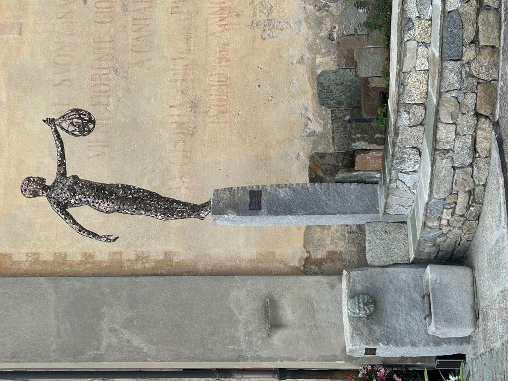 Bianca si eleva su un sasso donato da Arnalda Barbaglia, in memoria del nonno scalpellino, richiamando l’origine montana delle acque.