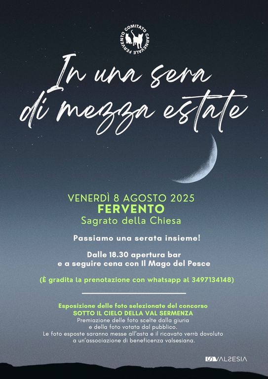 A Fervento, nella suggestiva cornice del sagrato della Chiesa, venerdì 8 agosto si terrà l’evento “In una sera di mezza estate”, una serata pensata per riunire la comunità all’insegna della condivisione e della beneficenza.