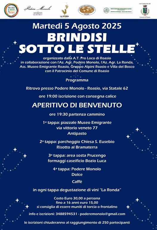 Organizzato dalla Pro Loco di Roasio, in collaborazione con Podere Monolo, l'Azienda Agricola 'La Ronda', il Museo dell'emigrante di Roasio, e il Gruppo Alpini di Roasio e Villa del Bosco, il ritrovo sarà alle ore 19:00 presso il Podere Monolo (via Statale 62, Roasio) per le iscrizioni e la consegna dei calici.