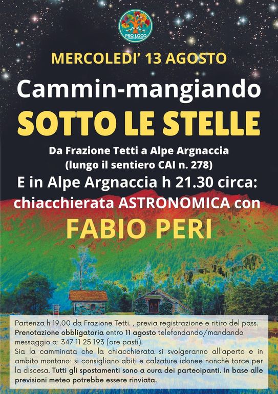 Il ritrovo è fissato per le ore 19 nella frazione Tetti, da cui i partecipanti partiranno lungo il sentiero CAI n. 278 alla volta dell’Alpe Argnaccia. Qui, attorno alle 21.30, è in programma una chiacchierata astronomica con Fabio Peri, che guiderà lo sguardo dei presenti tra costellazioni e curiosità celesti.