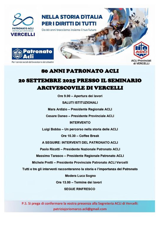 Il Patronato ACLI di Vercelli festeggia nel 2025 i suoi 80 anni di attività a sostegno di lavoratori, famiglie e cittadini italiani e stranieri. Per celebrare questo importante traguardo, il 20 settembre si terrà un convegno presso il Seminario Arcivescovile di Vercelli, dedicato alla storia e all’impatto del Patronato sul territorio.