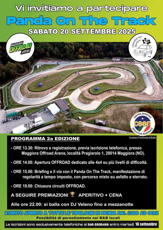 La Maggiora Offroad Arena ha accolto centinaia di appassionati per la seconda edizione di Panda On The Track, manifestazione affiliata CSEN e dedicata a tutte le Fiat Panda, dal 1980 ai giorni nostri. L'evento organizzato da I Pandisti del Biellese, in collaborazione di Maggiora Offroad Arena, è diventato un appuntamento ormai imperdibile per chi ama l’iconica utilitaria italiana, trasformata per un giorno in protagonista assoluta di pista e sterrato.