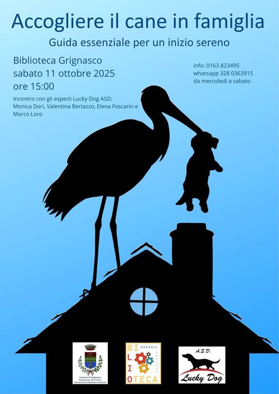 Accogliere un cane in casa è un momento emozionante, ma anche delicato e complesso, che richiede consapevolezza e responsabilità. Per guidare famiglie e cittadini in questo percorso, sabato 11 ottobre 2025, alle ore 15:00, la Biblioteca civica di Grignasco ospiterà l’incontro “Accogliere il cane in famiglia: Guida essenziale per un inizio sereno”, promosso dal Comune in collaborazione con l’associazione Lucky Dog ASD.