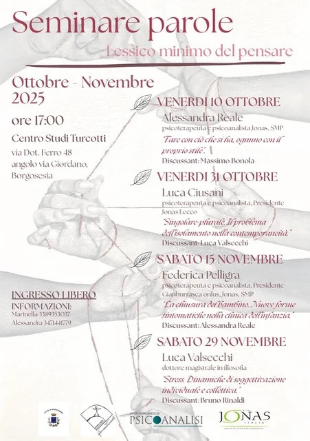 Riparte con la sua quarta edizione il ciclo di incontri “Seminare parole. Lessico minimo del pensare”, appuntamento culturale autunnale ormai consolidato in città. L’iniziativa, organizzata in collaborazione con il Centro Studi Turcotti e con il patrocinio di Jonas Italia, della Società Milanese di Psicoanalisi e del Comune di Borgosesia, propone un percorso di riflessione sul linguaggio, la relazione e il pensiero contemporaneo.