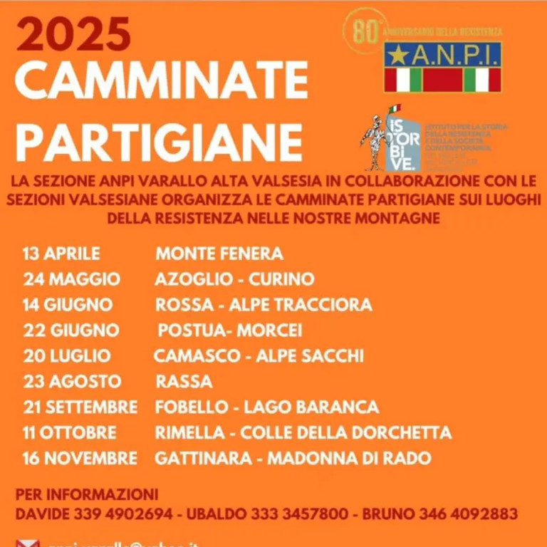 La Sezione A.N.P.I. Varallo Alta Valsesia, insieme alle sezioni valsesiane e all’Istorbive, presenta il nuovo ciclo delle Camminate Partigiane 2025, un’iniziativa che unisce memoria, natura e impegno civile lungo i sentieri che furono teatro della lotta di Liberazione.