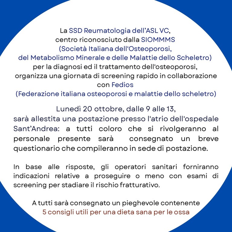 In occasione della Giornata mondiale dell’Osteoporosi, in programma lunedì 20 ottobre 2025, la SSD Reumatologia dell’ASL VC, centro riconosciuto dalla SIOMMMS (Società Italiana dell’Osteoporosi, del Metabolismo Minerale e delle Malattie dello Scheletro), organizza una mattinata di screening rapido gratuito in collaborazione con Fedios, la Federazione italiana osteoporosi e malattie dello scheletro.