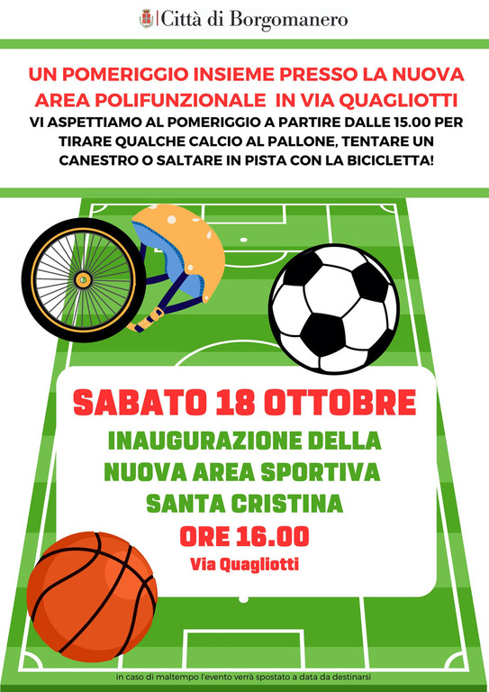Un pomeriggio di festa all’insegna dello sport e della condivisione: oggi, sabato 18 ottobre, a partire dalle 15.00, Borgomanero invita cittadini e famiglie a trascorrere qualche ora insieme nella nuova area polifunzionale di via Quagliotti, nel quartiere di Santa Cristina.