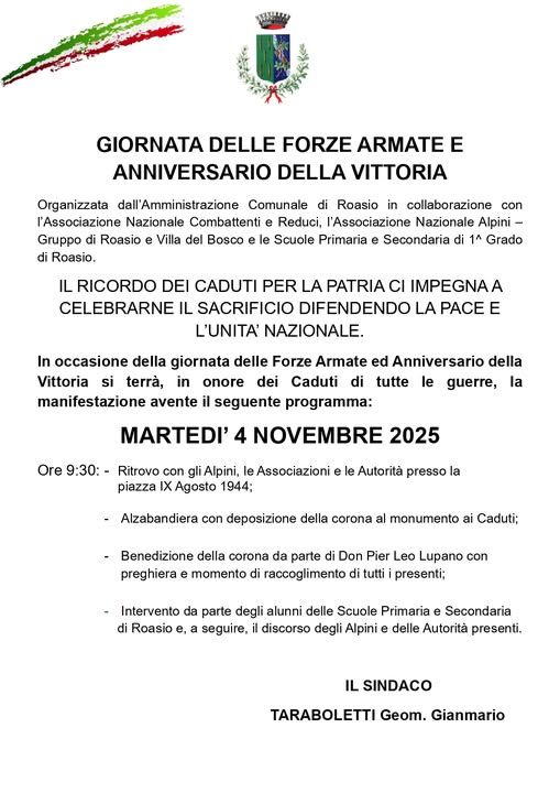 Il Comune di Roasio si prepara a celebrare la Giornata delle Forze Armate e l’Anniversario della Vittoria, in programma martedì 4 novembre 2025 a partire dalle ore 9.30.